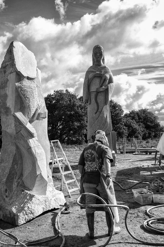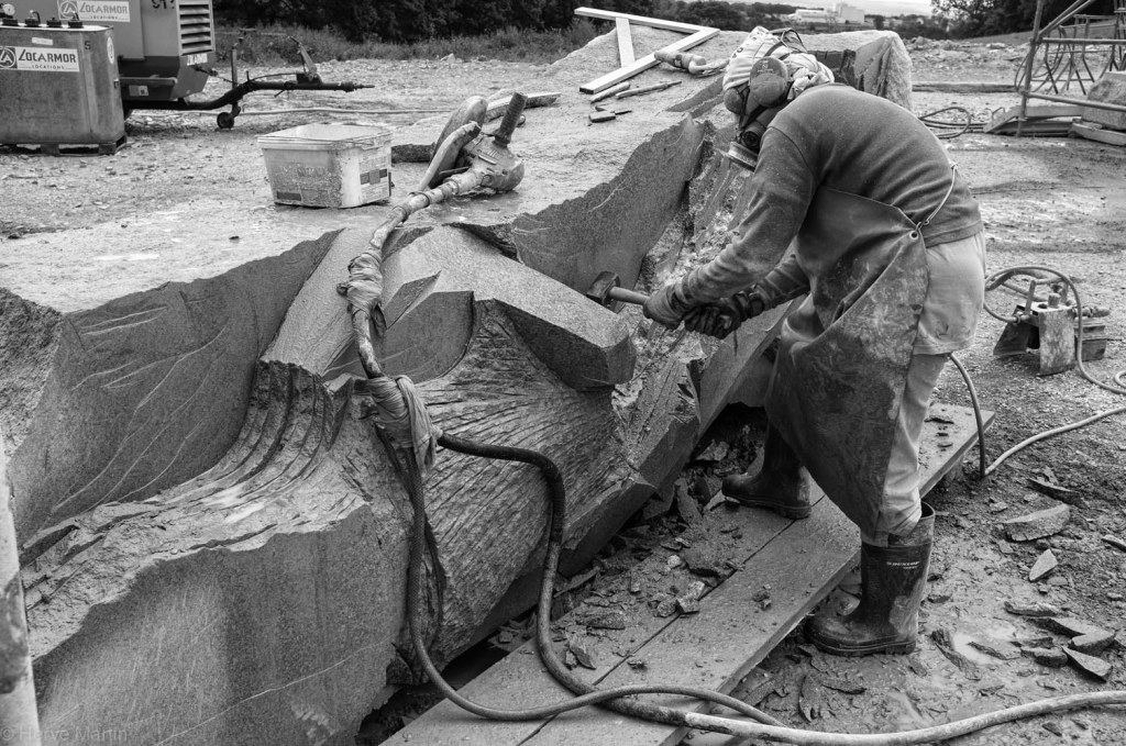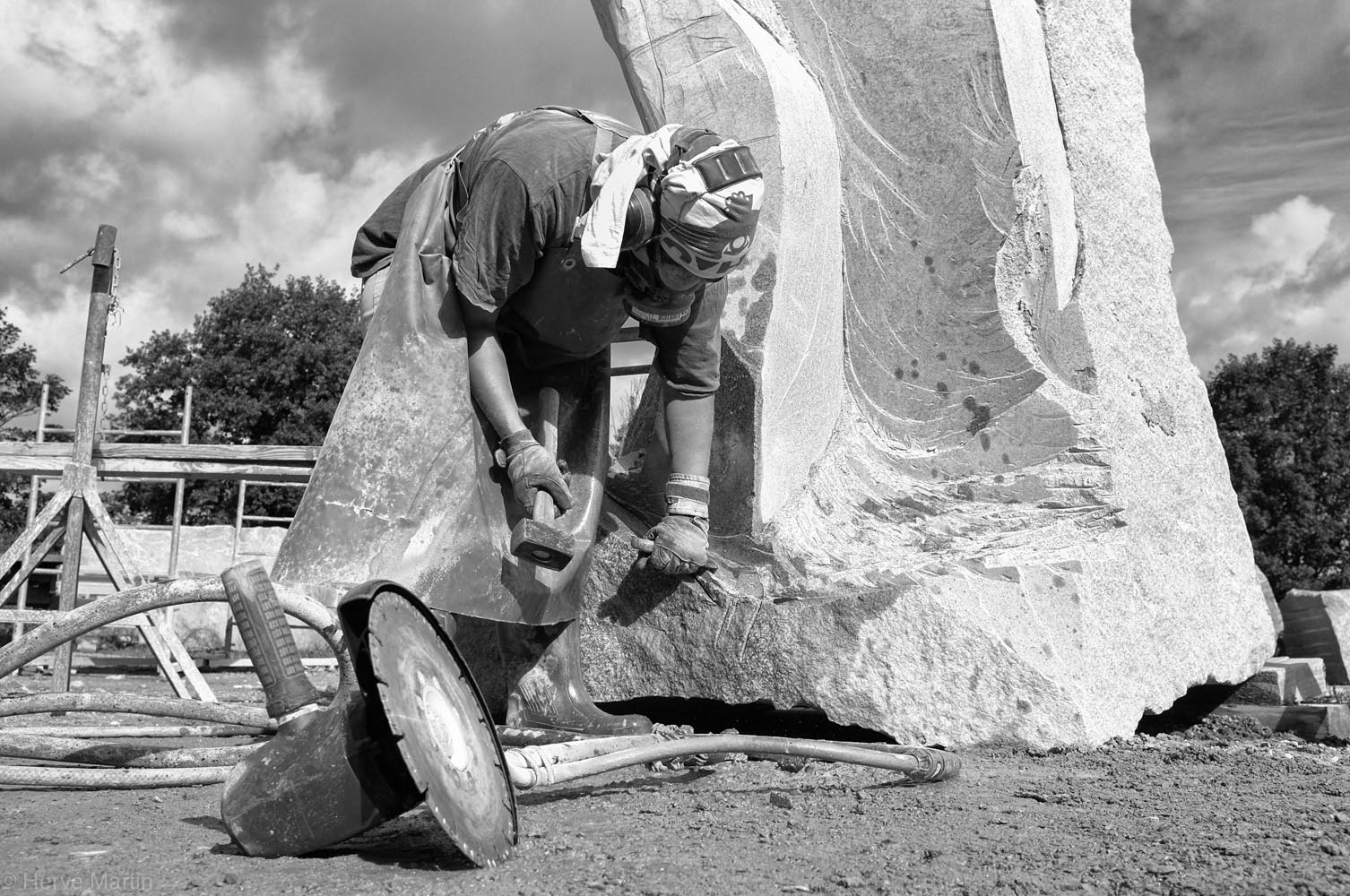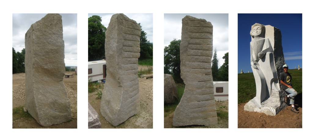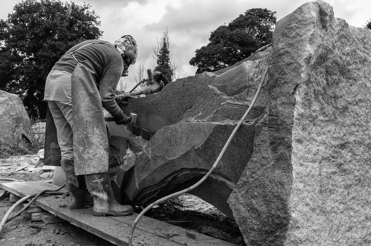 avant : le bloc de granite de Cléder / après : la sculpture installée